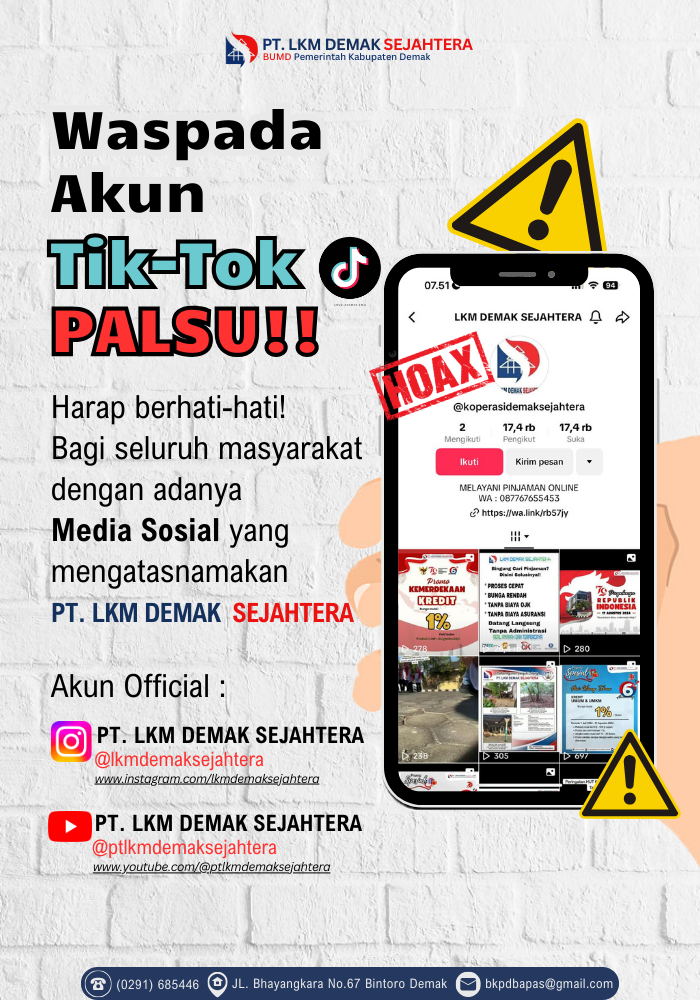 Diberitahukan kepada seluruh nasabah PT. LKM Demak Sejahtera untuk dapat selalu berhati-hati terutama mengenai media sosial yang mengatas-namakan PT. LKM Demak Sejahtera. Berikut kami informasikan terkait berita akun media sosial palsu dan kami cantumkan akun media sosial kami yang asli/ official dalam informasi tersebut.