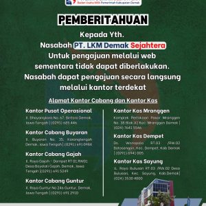 Kepada Yth. Nasabah PT. LKM Demak Sejahtera dan seluruh masyarakat. Diberitahukan untuk pengajuan secara online via web sementara ditutup/ dinonaktifkan, […]